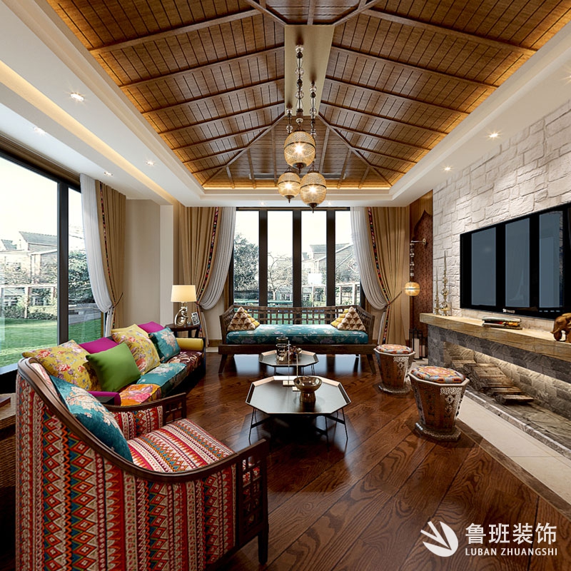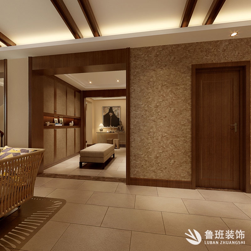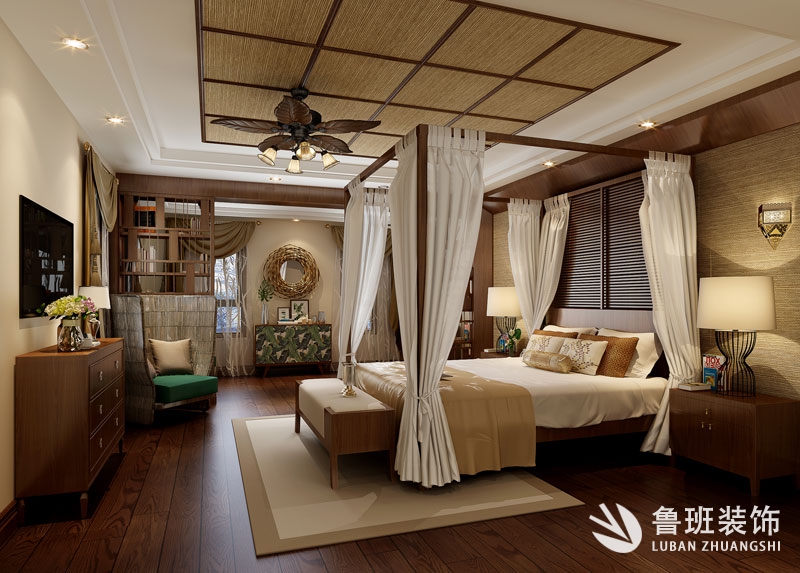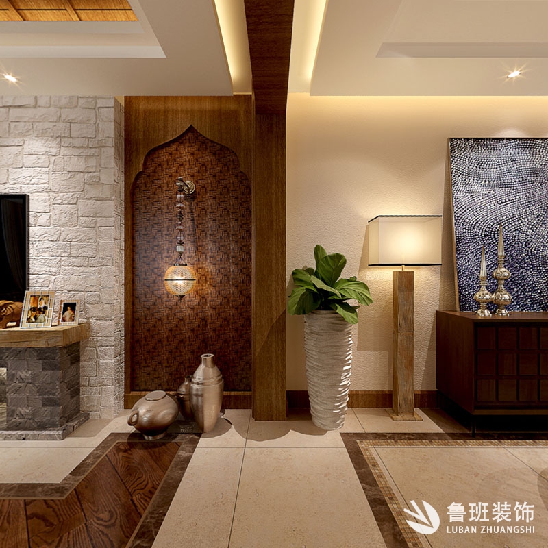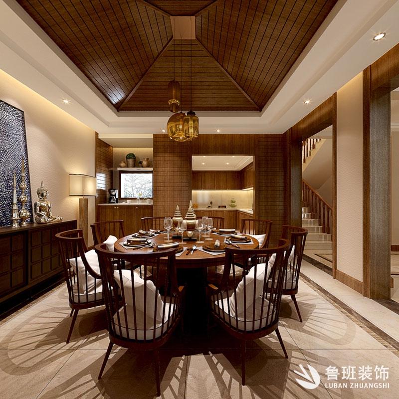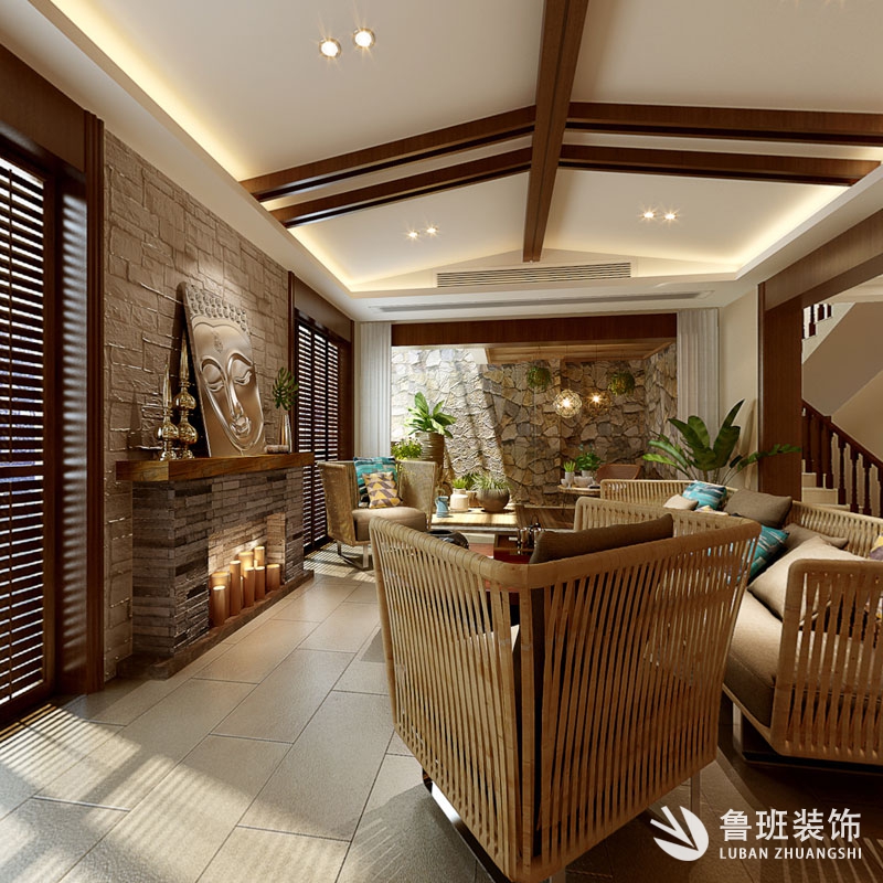 本案為東南亞風格,是一種結合了東南亞民族島嶼特色及精致文化品位的家居設計方式,多適宜喜歡靜謐與雅致、奔放與脫俗的裝修業主。這是一個居住與休閑相結合的概念。本案廣泛地運用木材和其他的天然原材料,如藤條、竹子、石材、青銅和黃銅,深木色的家具,局部采用一些絲綢質感的布料,燈光的變化體現了穩重及豪華感。